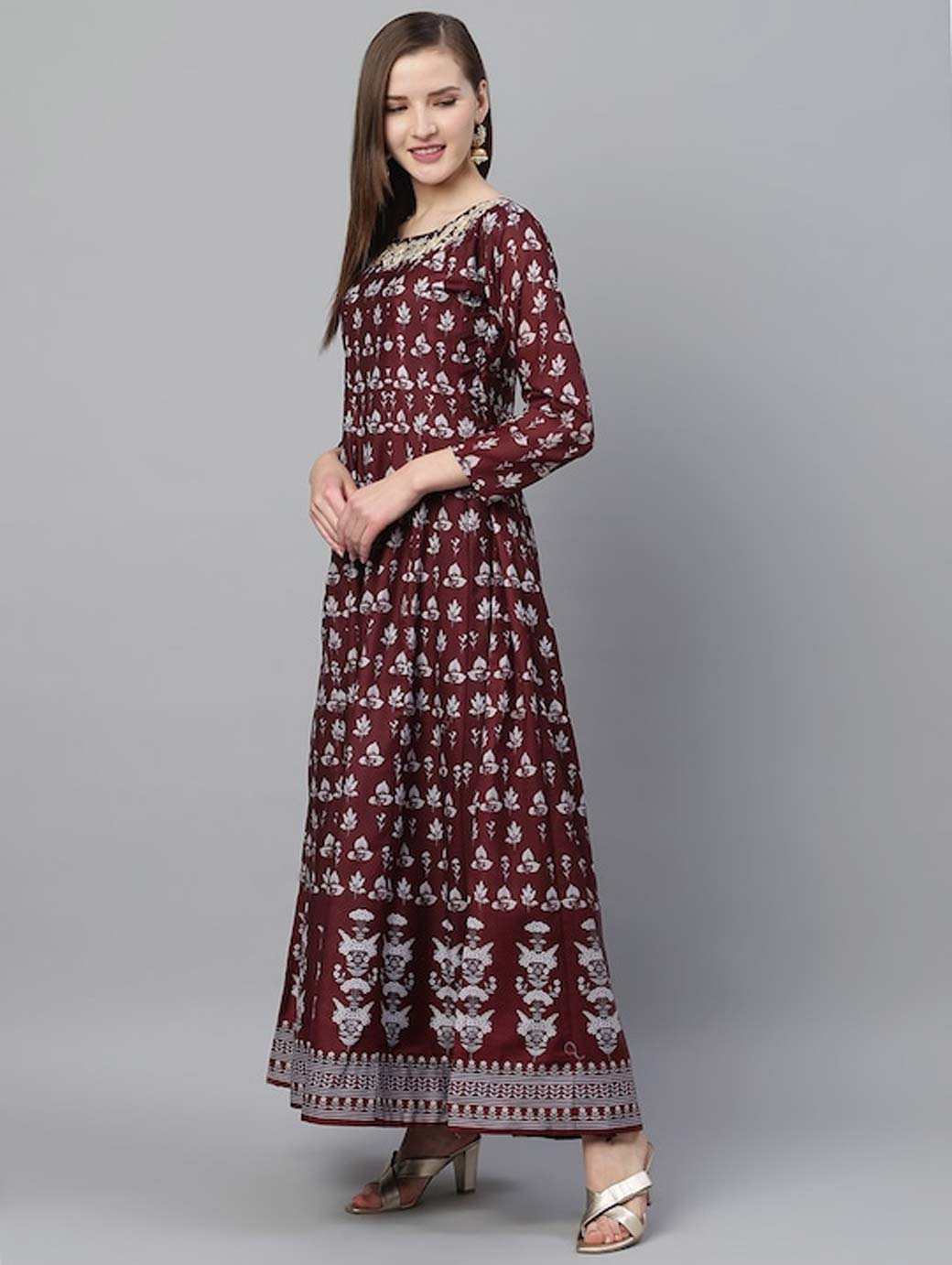 Coffee brown and off-white floral block printed panelled anarkali kurta, has a round neck with gotta patti detail, three-quarter sleeves, and flared hem Comes with a coffee brown nd off-white floral printed dupatta, gotta patti taped border
