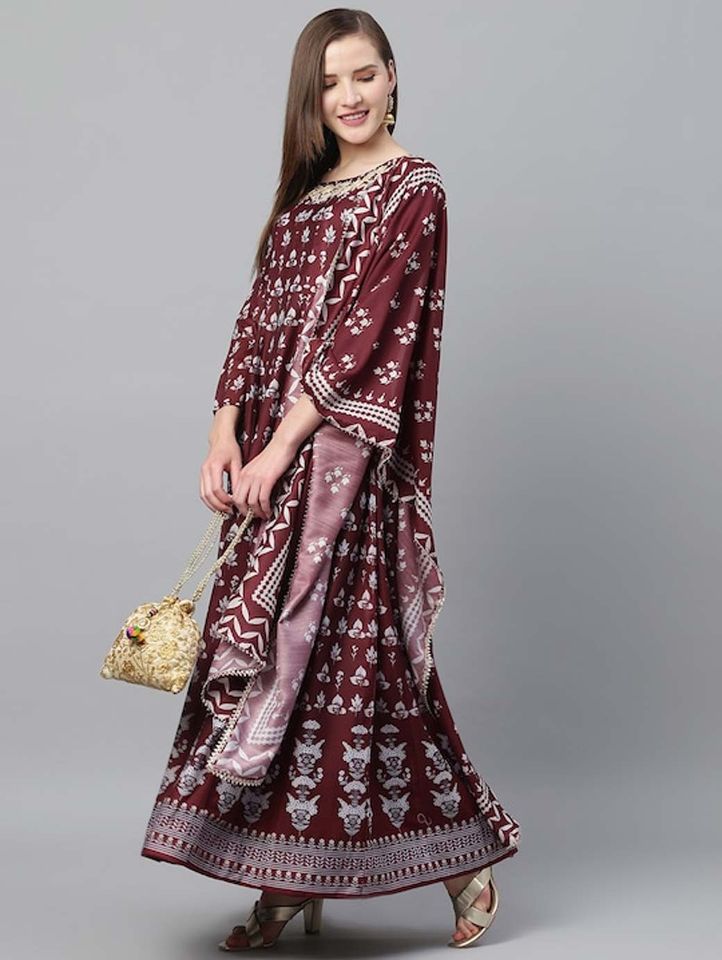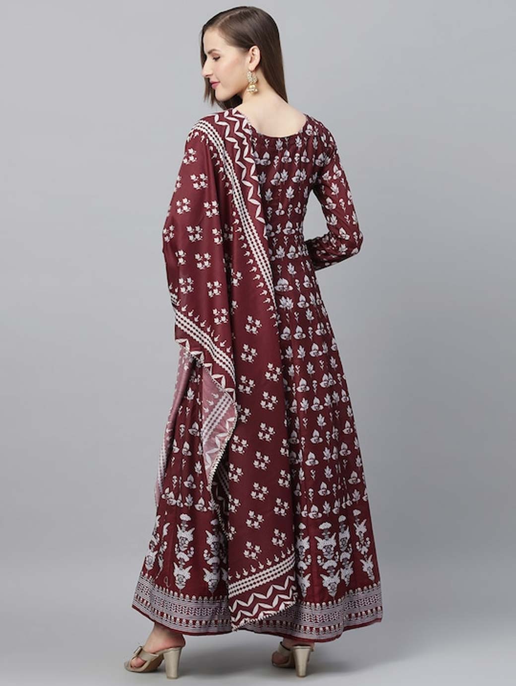 Women Coffee Brown & Off-White Floral Block Printed Anarkali Kurta with Dupatta