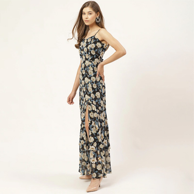 Black & Off-White Floral Print High-Slit Tiered Maxi Dress