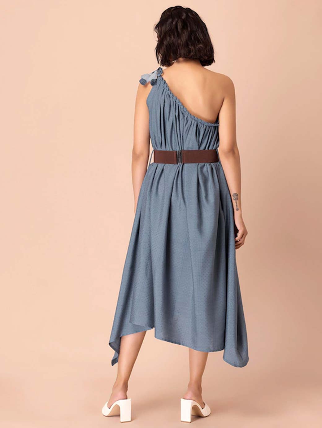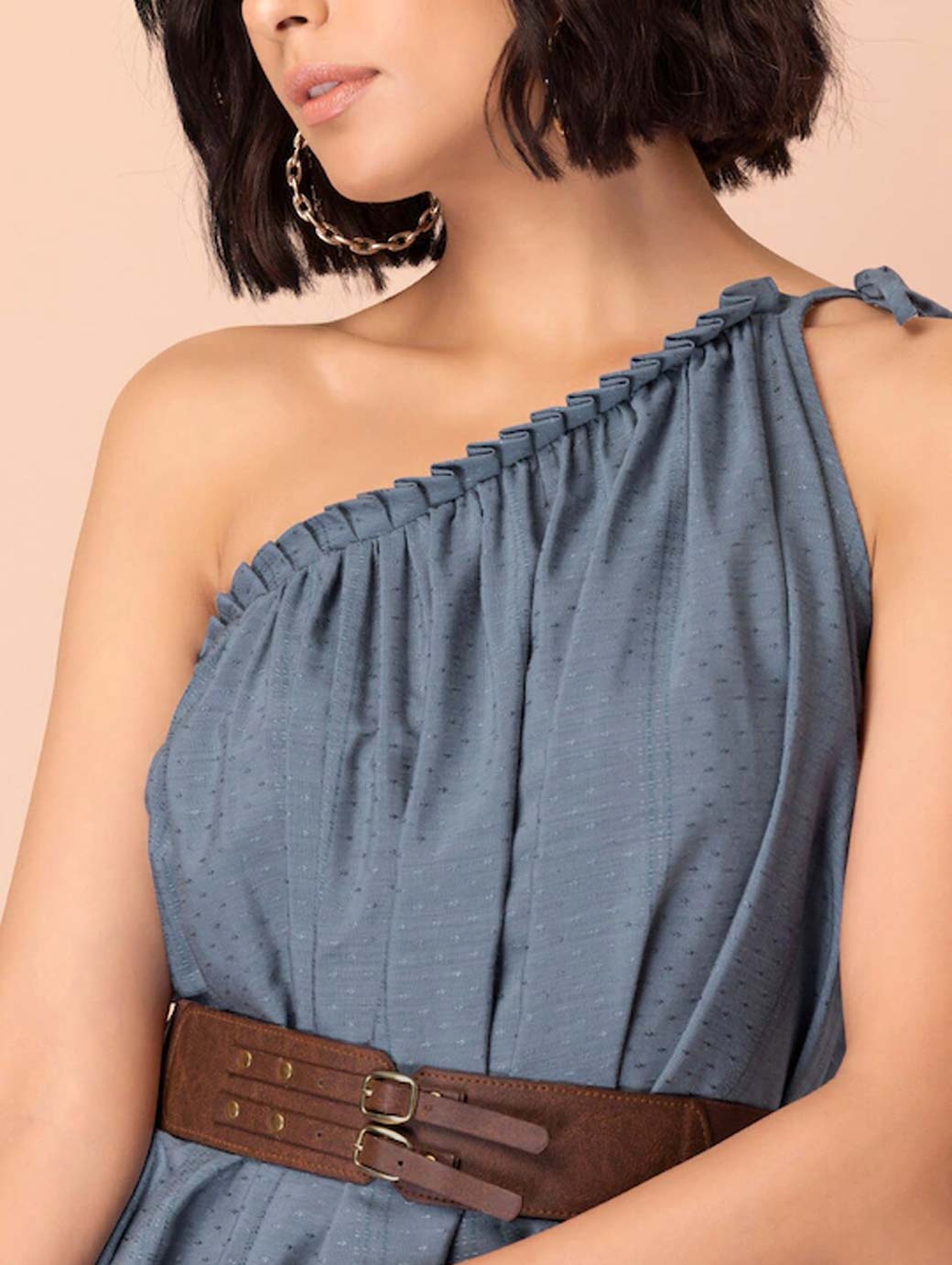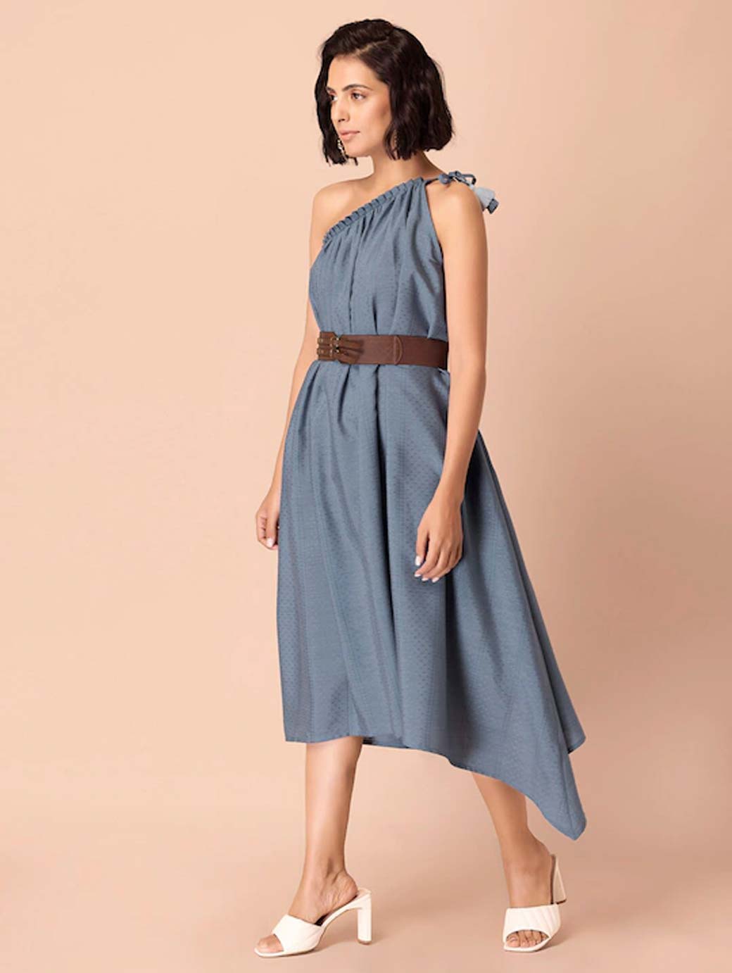Blue One Shoulder Dress with Leather Belt