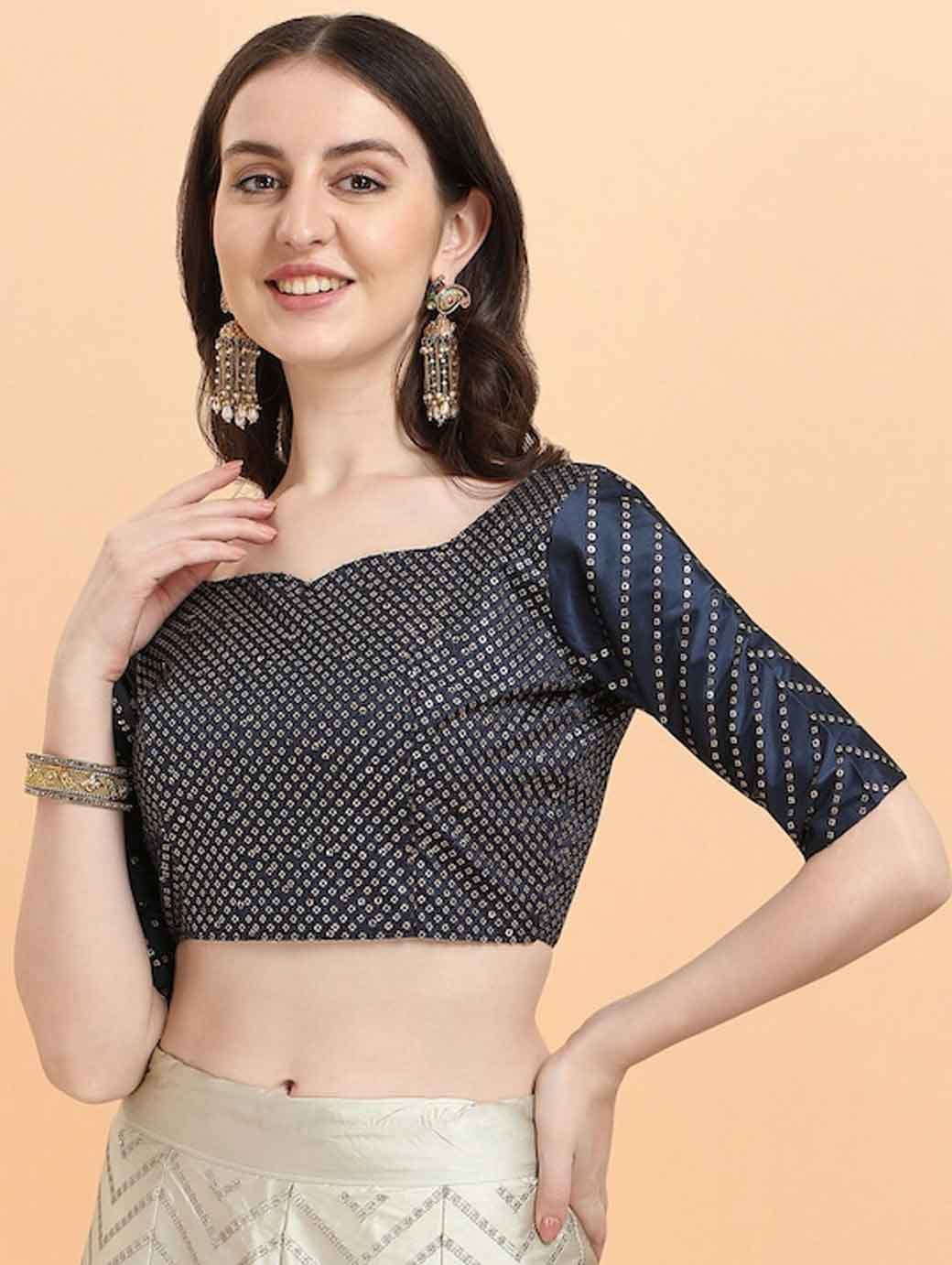 Cream-coloured and navy blue embellished unstitched blouse, has a round neck, short sleeves, cream-coloured and navy blue embellished semi-stitched lehenga, flared hem
