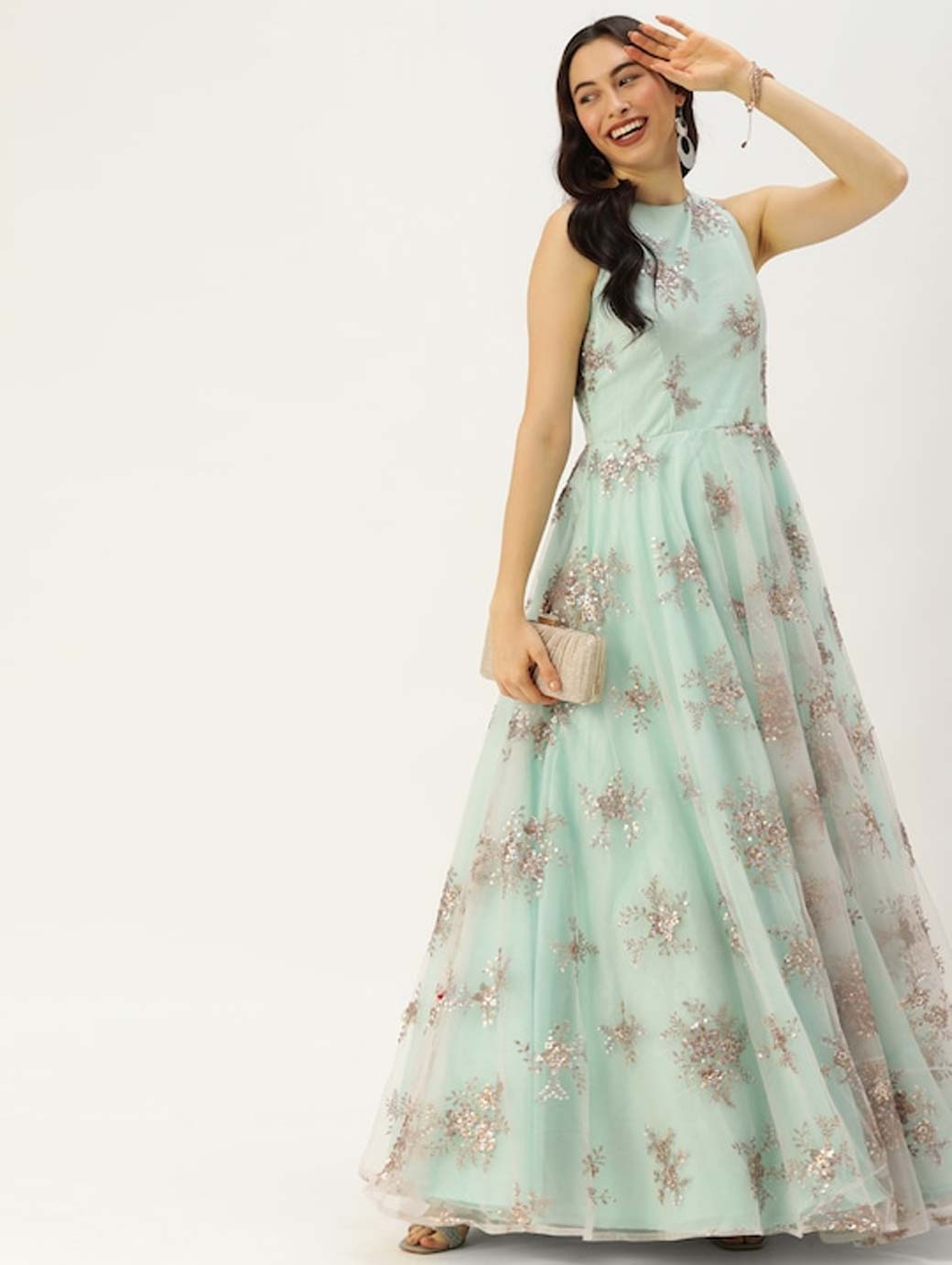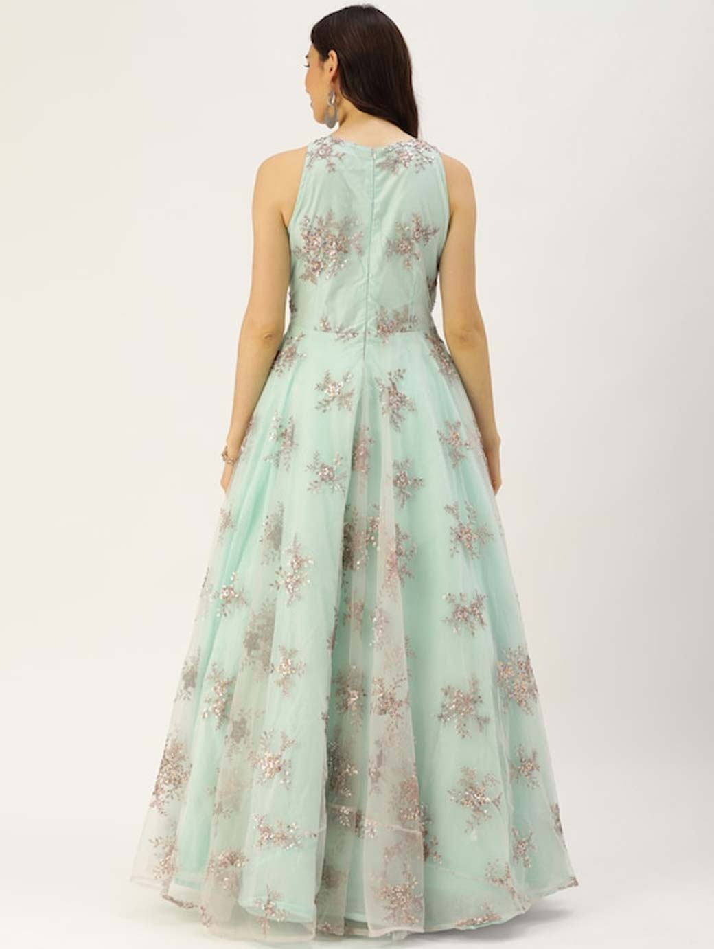Green and golden sequinned Made to Measure Maxi Gown Round neck Sleeveless, no sleeves Gathered or pleated detail Maxi length in flared hem Net fabric Concealed zip closure.