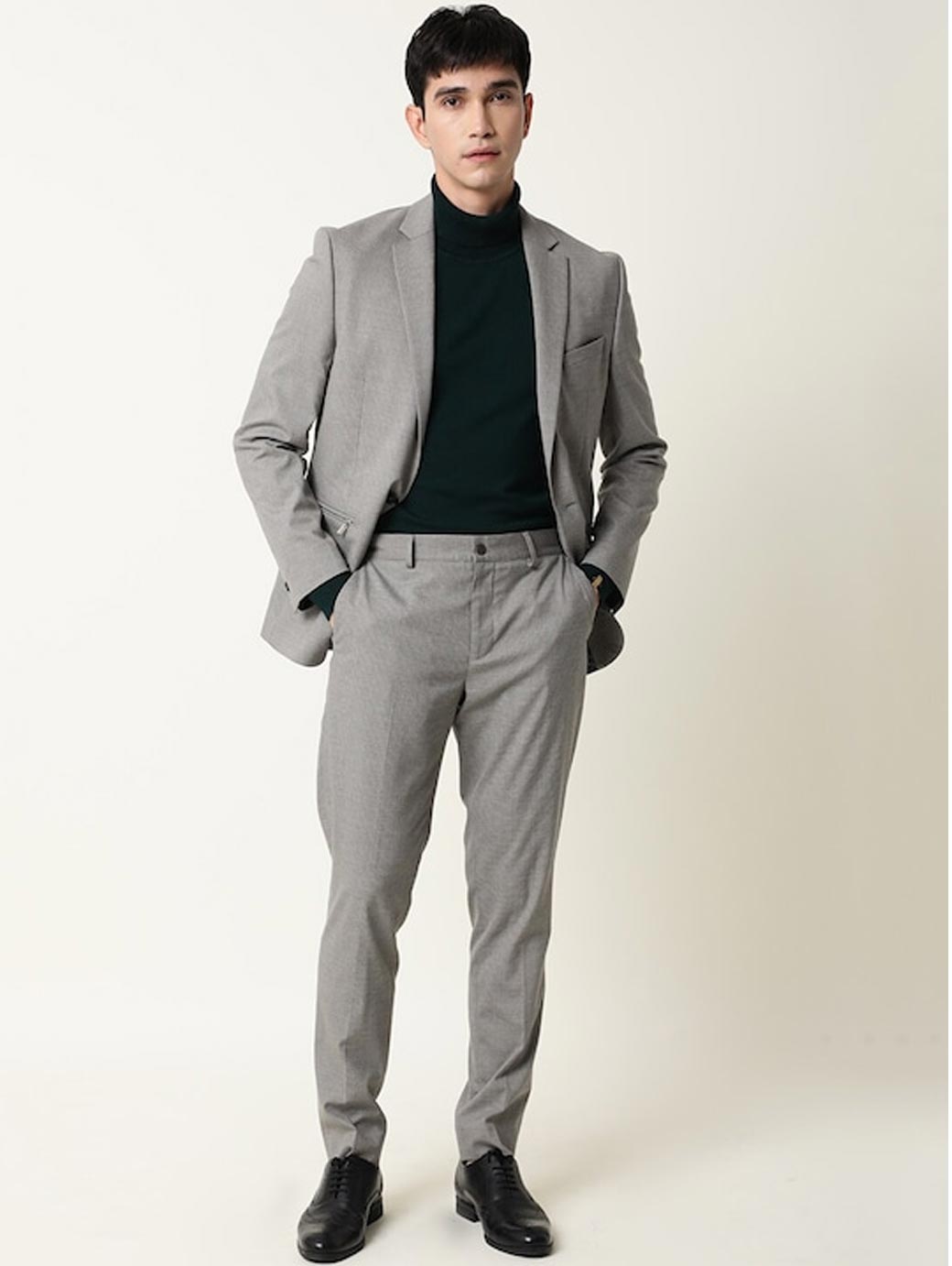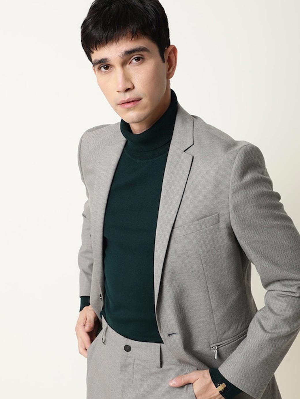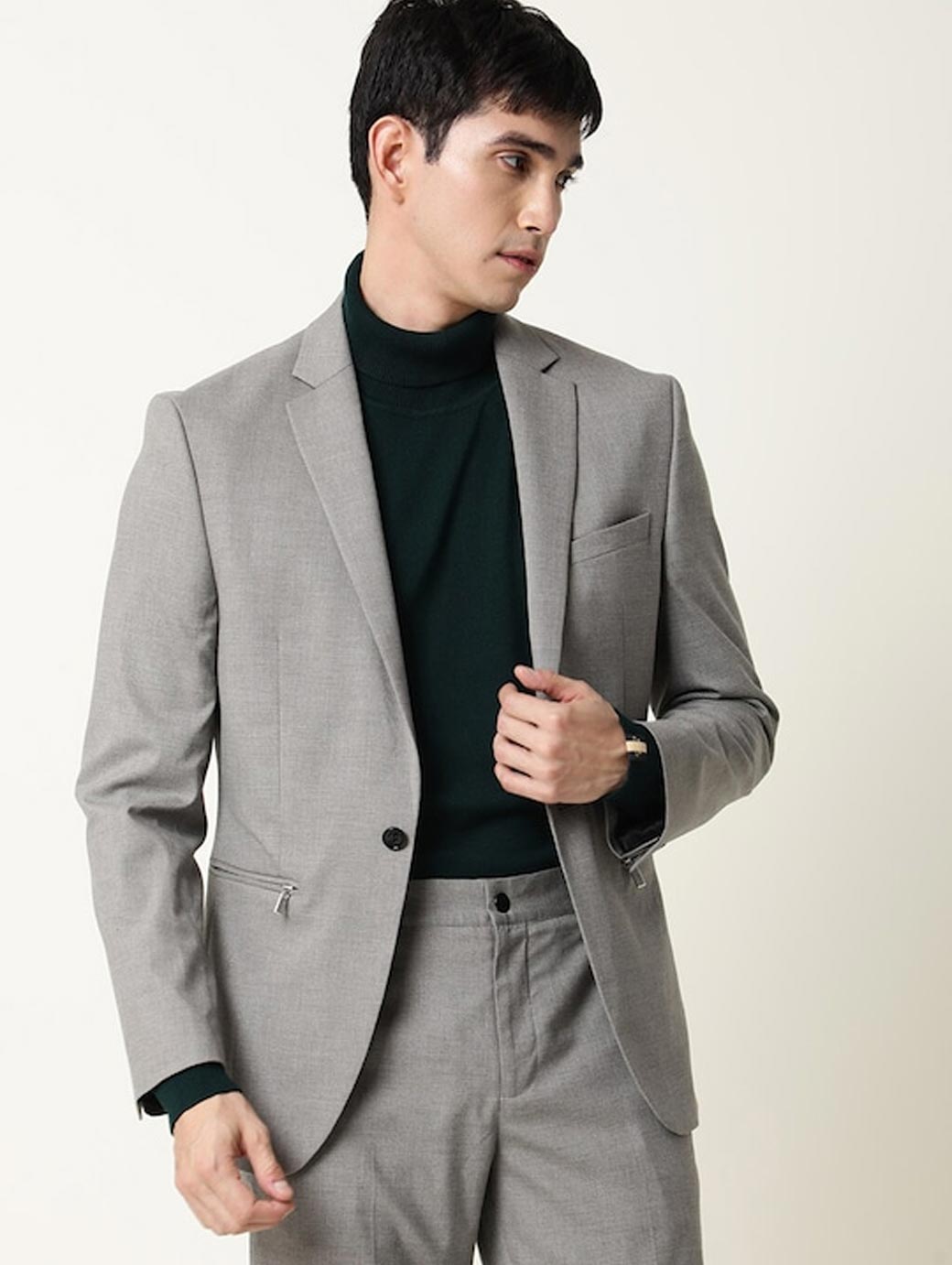 Men Grey Solid Single-Breasted Slim-Fit Formal Blazer