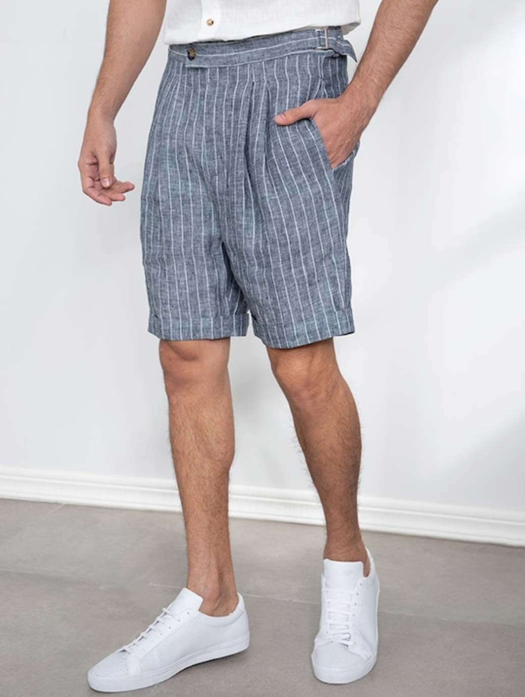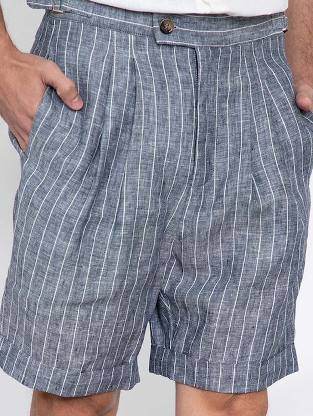 Men Grey Striped Linen Slim Fit Pleated Shorts
