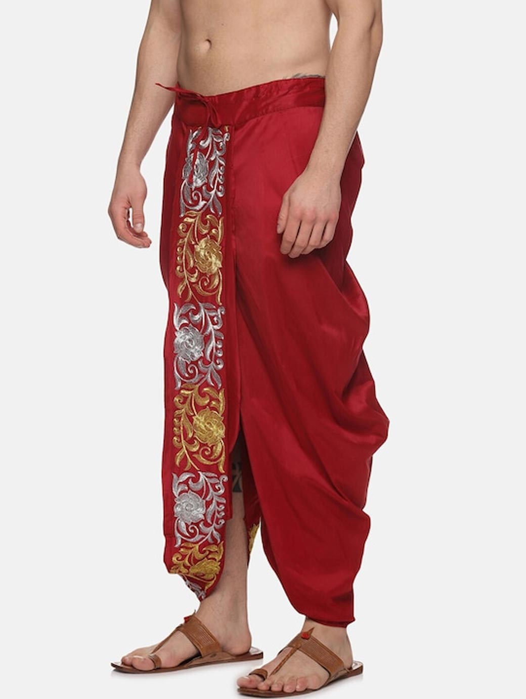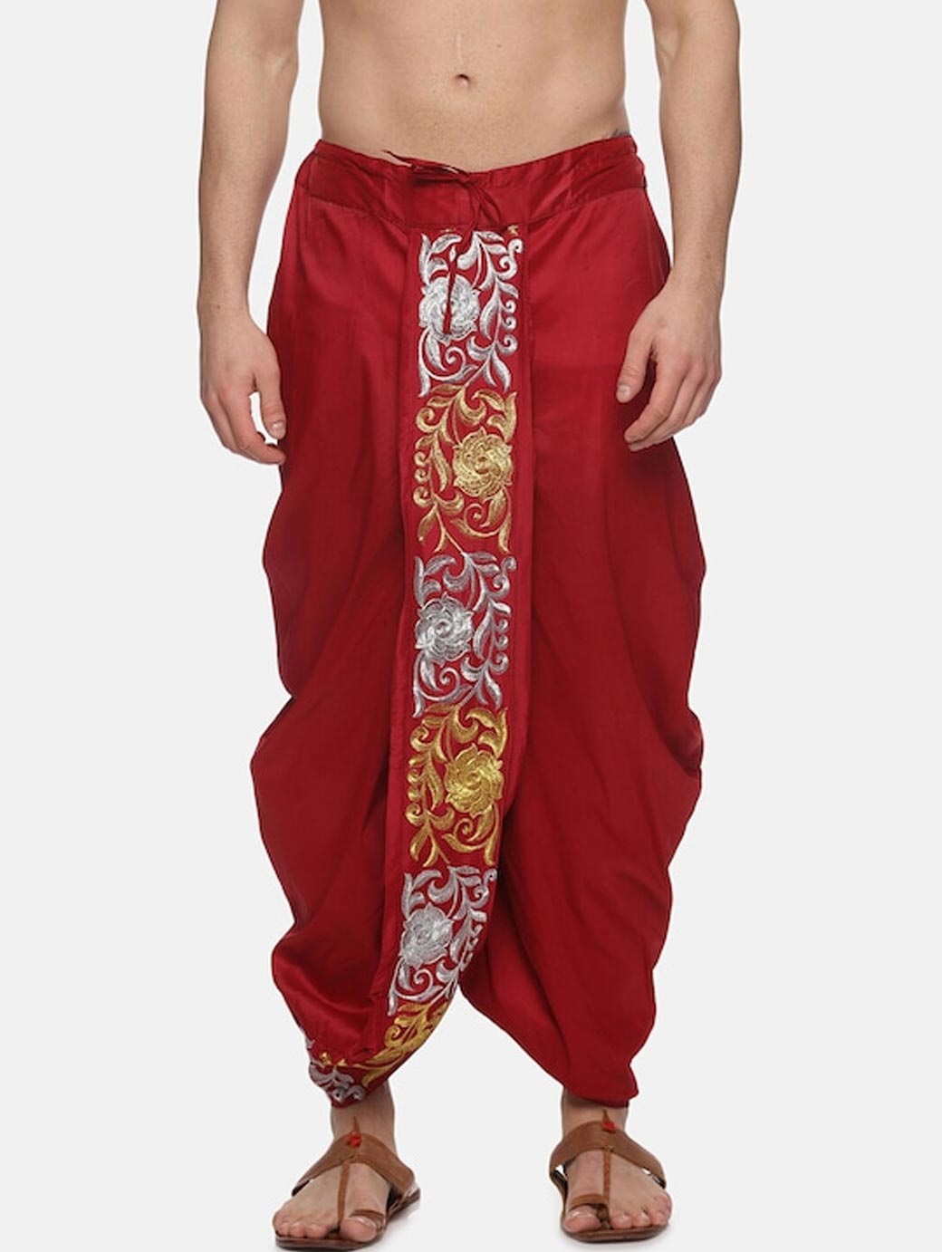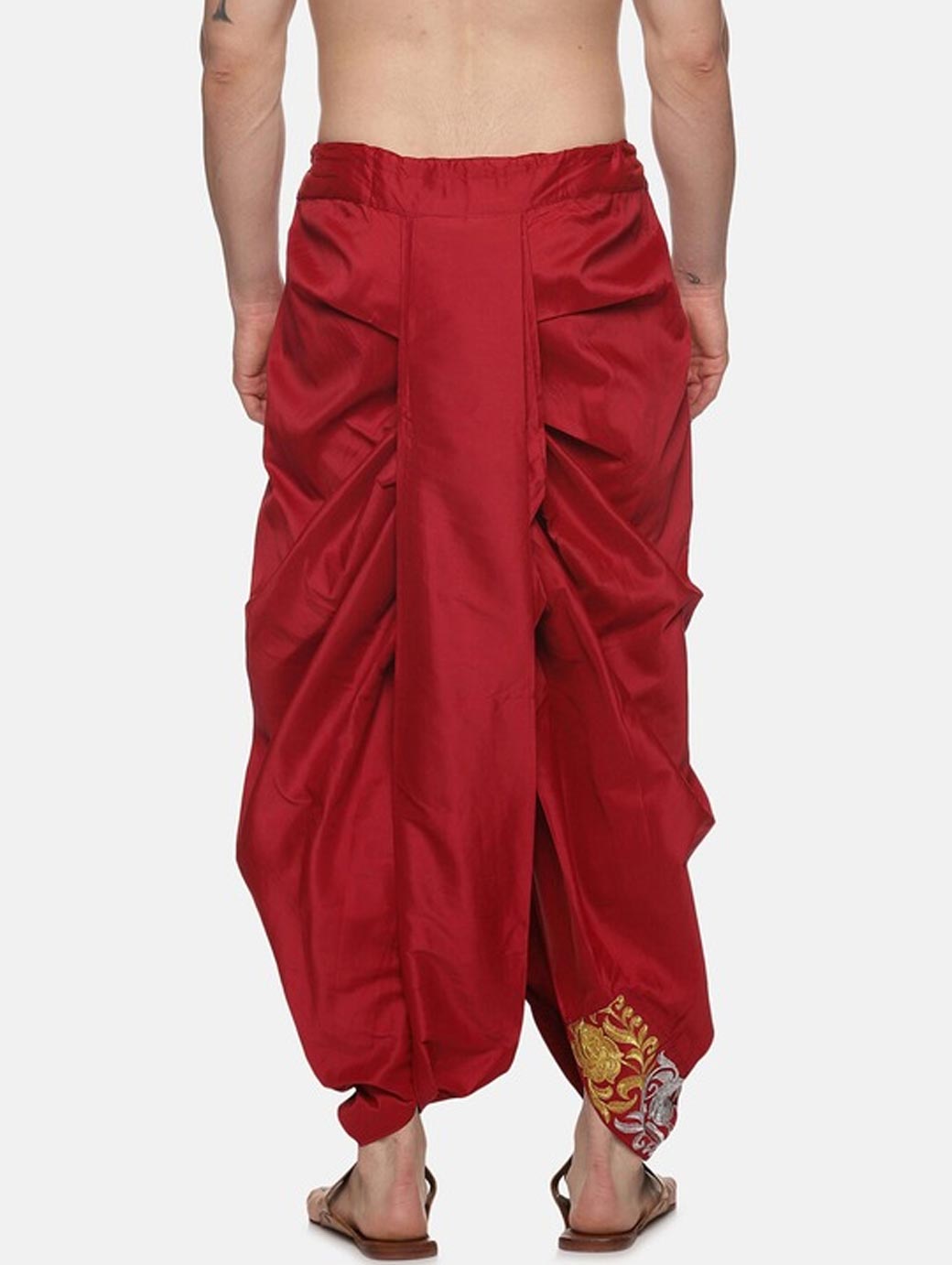 Maroon embroidered regular-fit dhoti pants with overlap detail, has gathers, has an elasticated waistband with a drawstring fastening