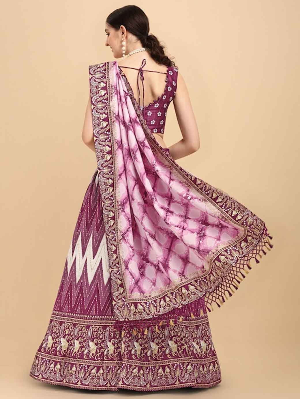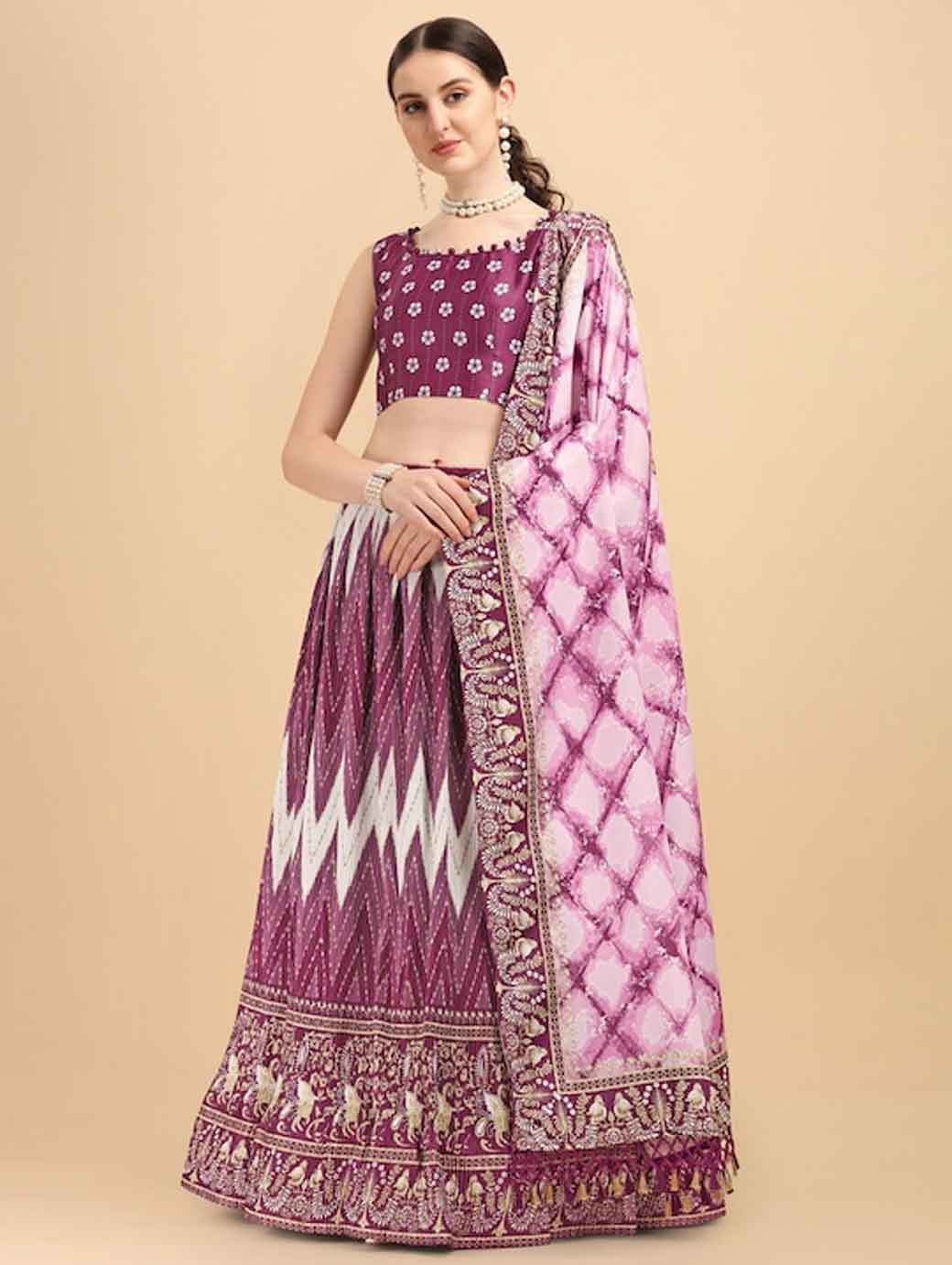 Purple and white printed unstitched blouse, has a round neck, sleeveless, purple and white printed semi-stitched lehenga, flared hem