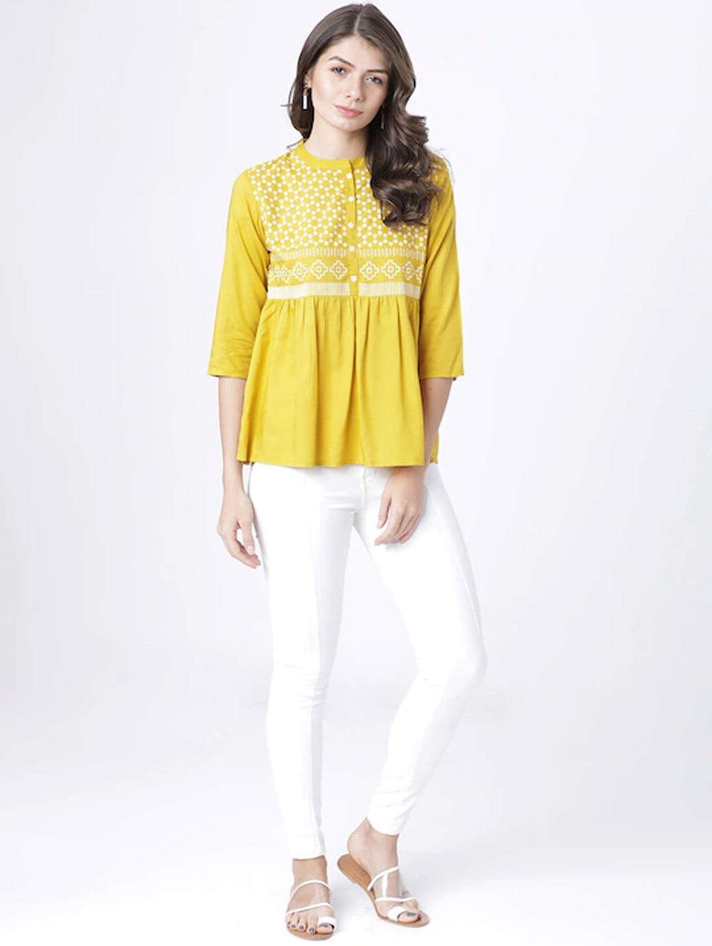 Mustard regular a-line Top printed woven round neck three-quarter sleeves , regular sleeves sleeves gathered or pleated 2021 hem button.