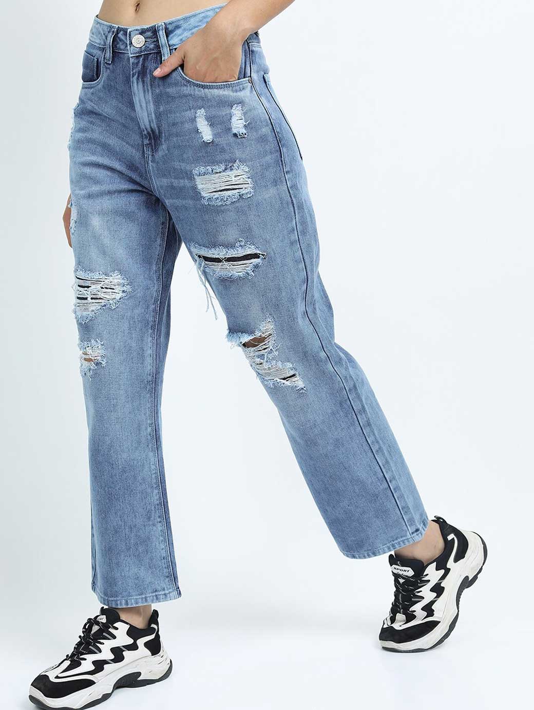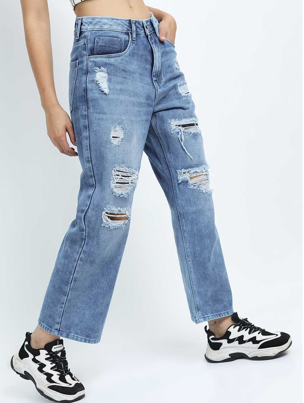 Women Blue Wide Leg Highly Distressed Heavy Fade Jeans