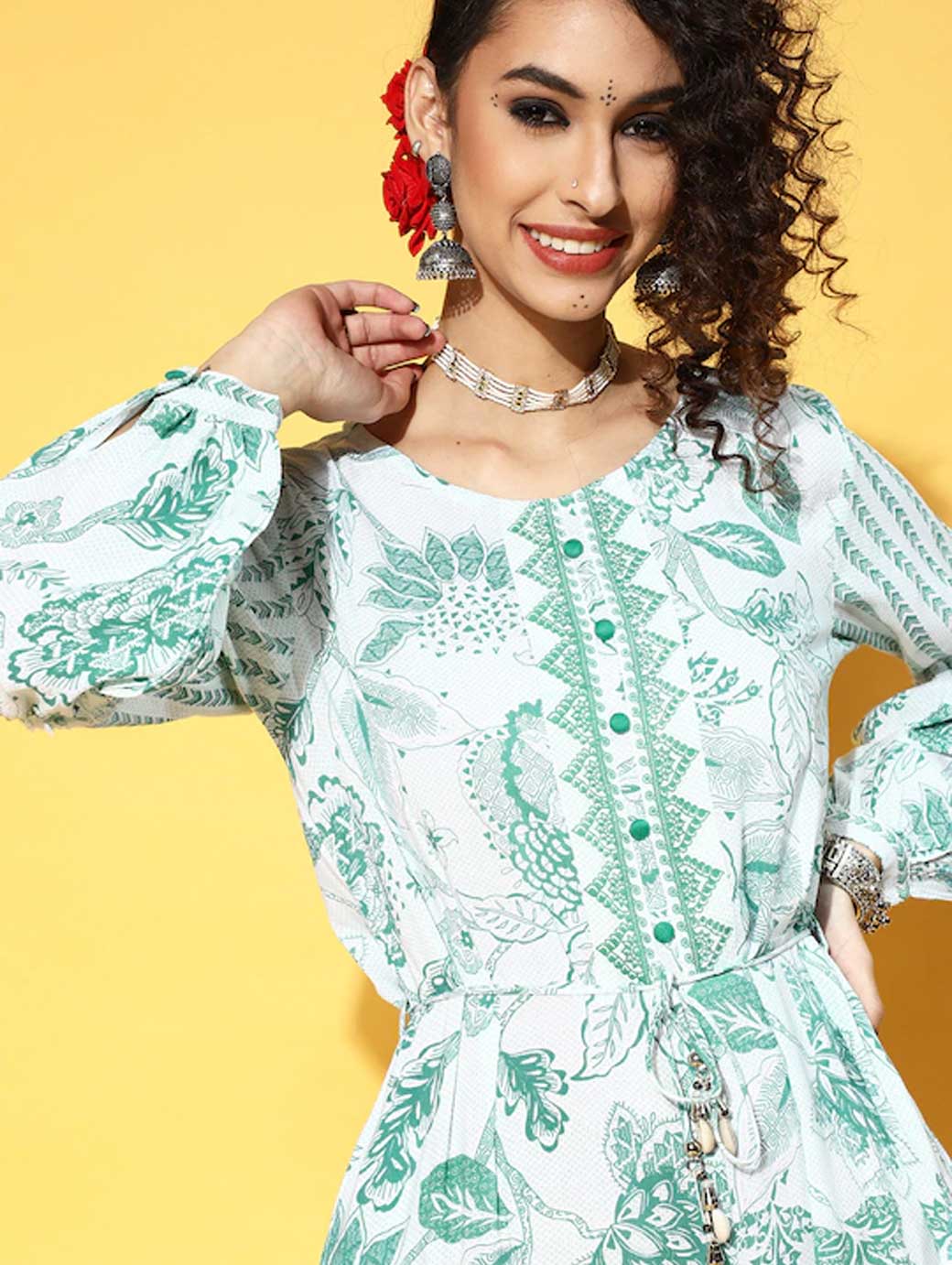 Ideal for everyday wear, this jumpsuit is both stylish and comfy. It is crafted with a beautiful printed pattern and attractive round neck to elevate your appeal. Gorgeous green shade Printed pattern Round neck Long sleeves Viscose rayon, hand wash Trend Alert Elevated bottoms include any to every pair of bottoms that are designed with edgy details, like a flare, slit, tiering, pleats, and so on. The trendy prints and patterns, such as ombre, warli, quirky, polka dots, garden artist, pastel colour-blocking, floral, etc. further enhance their appeal.