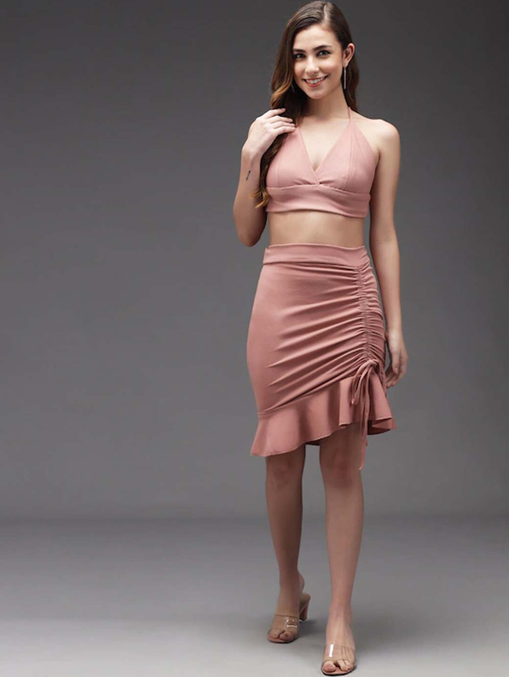 Mauvevsolid knee length pencil skirt with gathered detail, has an elasticated waistband with slip-on closure and straight hem