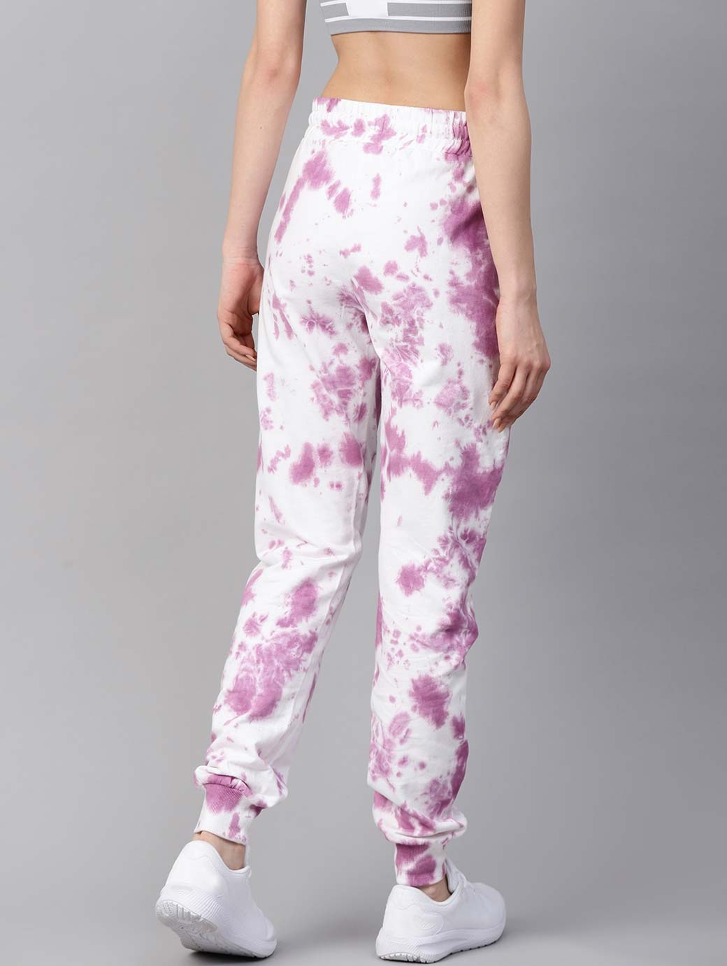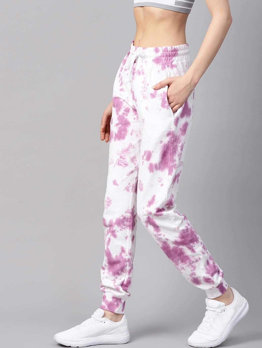 White and purple dyed joggers, has an elasticated waistband with drawstring closure, two pockets and cuffed hems